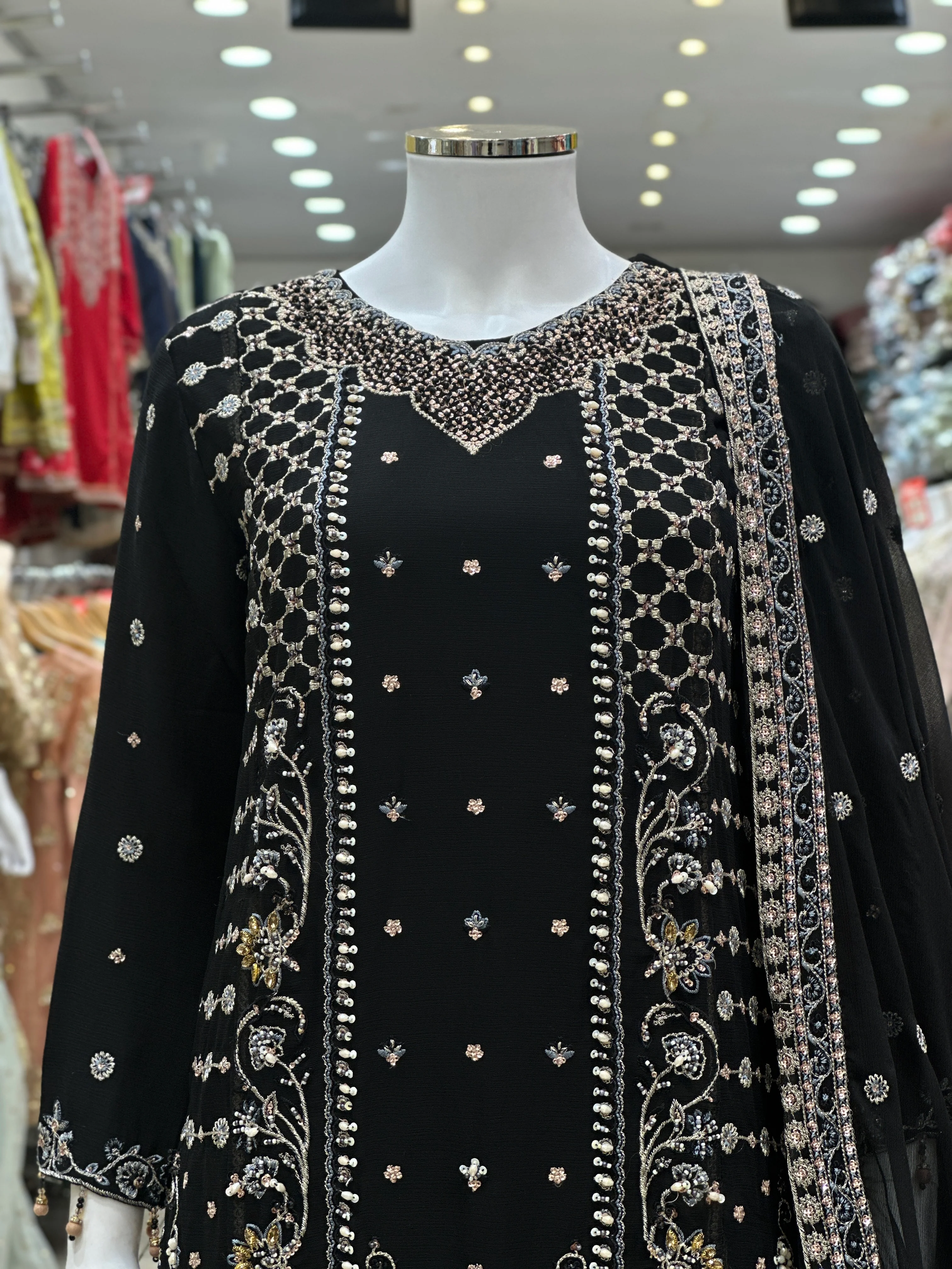 A luxurious 3-piece ensemble designed to elevate your festive wardrobe. This collection features a stunning chiffon shirt paired with a beautifully crafted garara, offering the perfect balance of elegance and modern flair. The chiffon shirt boasts delicate embroidery, intricate embellishments, and a graceful flow, making it ideal for the Eid celebrations. The garara trousers are designed with a flared, voluminous silhouette, adding a traditional yet contemporary touch to the outfit. This 3-piece set includes a chiffon dupatta, completing the look with refined detailing and an ethereal charm. Whether you're attending an Eid gathering or a special celebration